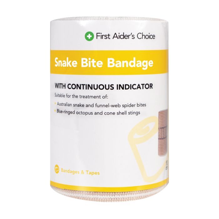 First Aiders Choice premium heavyweight conforming bandage is ideal when applying the Pressure Immobilisation Technique recommended for anyone bitten by a venomous snake. This bandage will help to stay calm and focused during an emergency, as the rectangle indicator becomes a square to let you know when optimal tension has been achieved. The rectangle indicator is continuously marked on the bandage to ensure correct pressure over the entire limb is applied. Suitable for the treatment of Australian snake and funnel-web spider bites and also Blue-ringed octopus and cone shell stings.