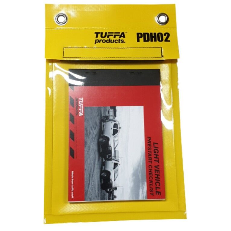 Protect your Work Permits and other important documentation from the weather with TUFFA™ Products Permit Document Holder. Made from 0.4mm reinforced tarp material with 1mm UV clear PVC front with 2 x heavy duty 10mm eyelets. Sized to suit A5 documents and books. Waterproof for outdoor use with a sewn velcro strip for extra strength. Proudly Australian Made.